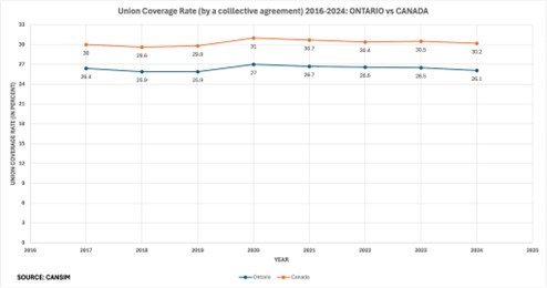 Figure 1: Union Coverage Rates from 2016-2024, Ontario vs Canada.87